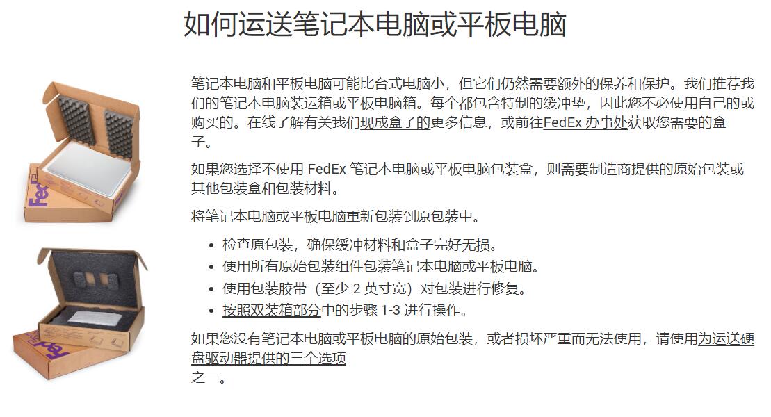 我们建议使用易于包装的笔记本电脑盒进行运输。它专为笔记本电脑设计,包含您需要的所有包装材料和缓冲垫。了解有关我们的笔记本电脑包装盒和其他包装材料(例如重型双壁包装盒)的更多信息。或者查找您附近的易起国际速递 办事处。