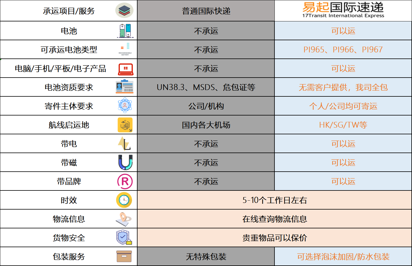 易起国际速递为了能发运各类电池类货物,已经在香港机场联合DHL/UPS/TNT/FEDEX/ARAMEX备案电池资料,在香港具备数码产品进出口许可,电信通讯牌照,所以可以进行各类电池类的商品进行转运,包括但不仅限于手机,电脑等产品。